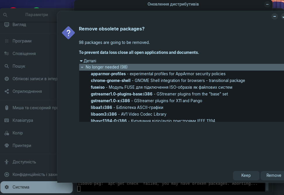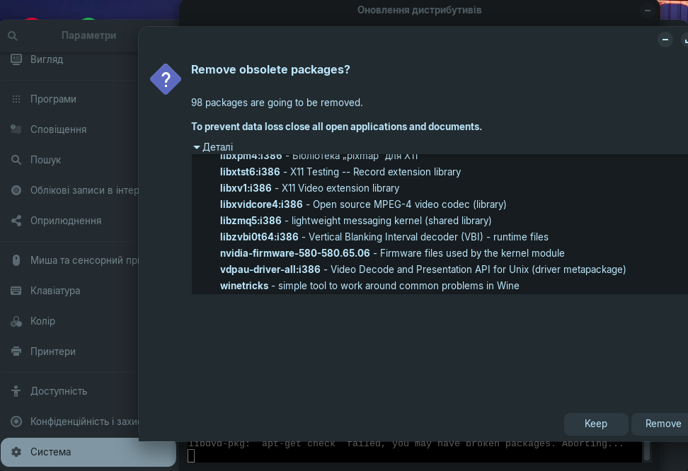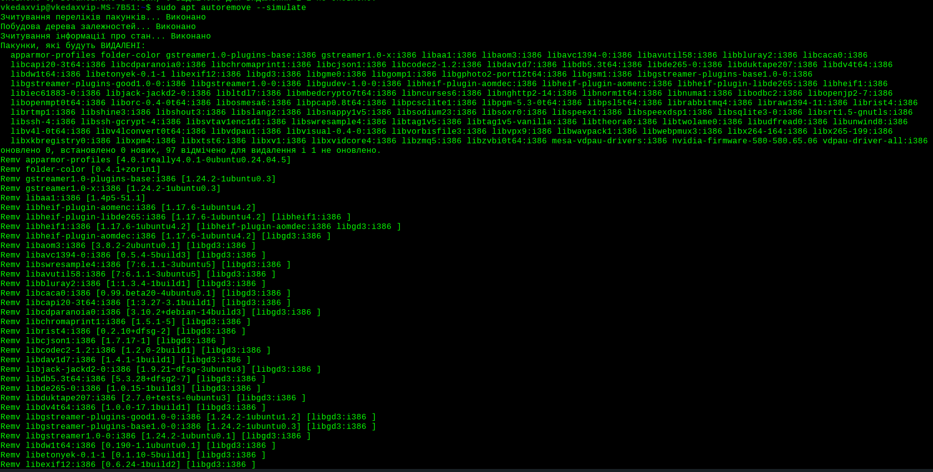 For some reason, it was suggested to remove 32-bit libraries and with them the applications that use or support them - somehow it's stupid, I left them, even if they are not used, they will be needed and take up almost no space.