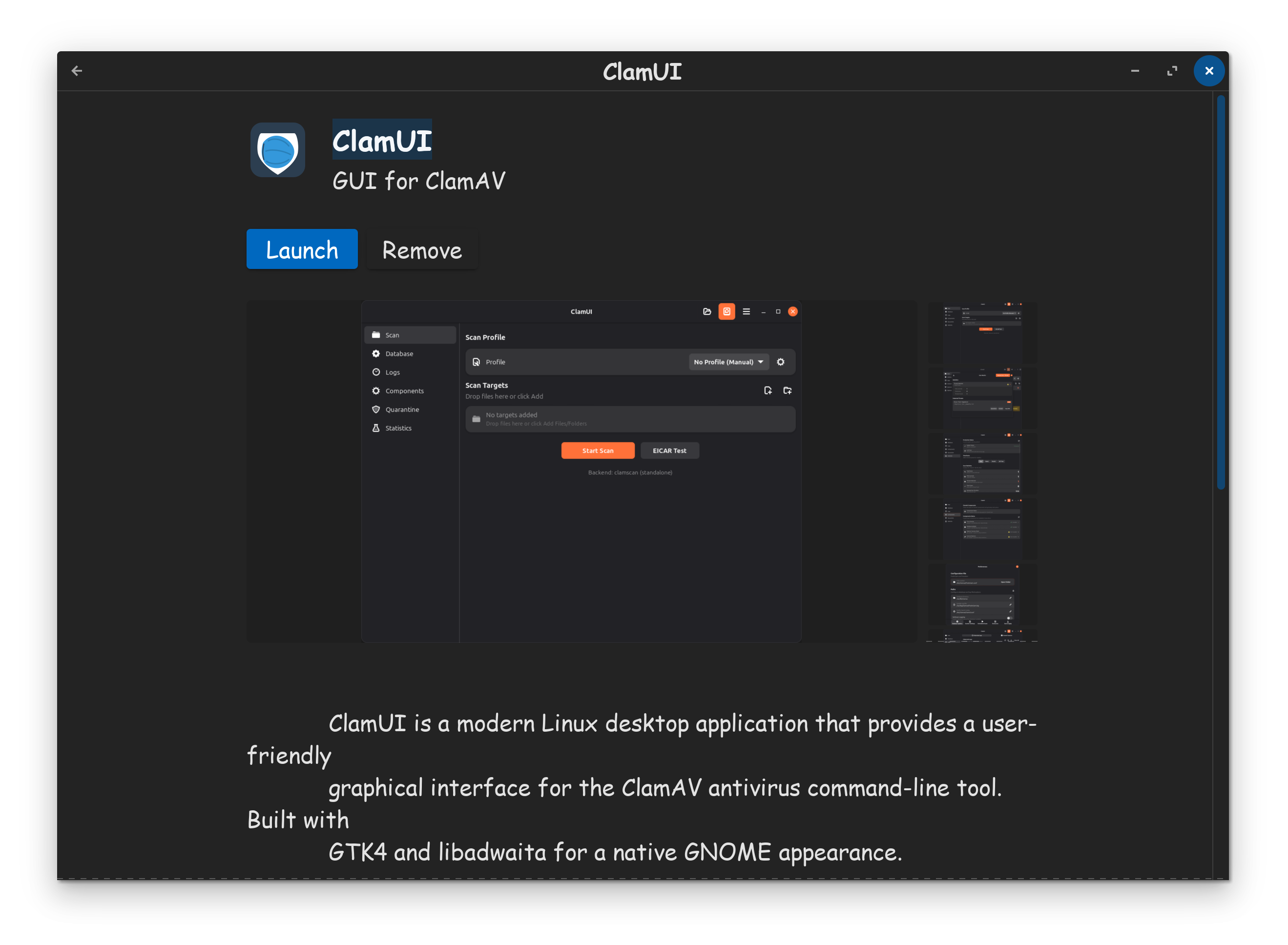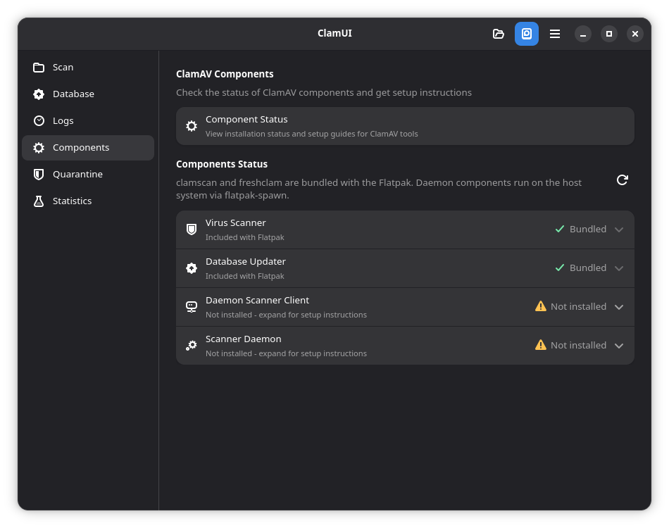 But I saw now an Alternative: ClamUI. It is made with GTK4 and LibAdwaita. It is like ClamTK a graphical Interface for ClamAV. It is offered as Flatpak, .deb and AppImage. the Developer recommends the flatpak. This doesn't only come with the UI itself. It includes also ClamAV. so, it isn't neccessary to install ClamAV seperately. You have all in one if You want so.