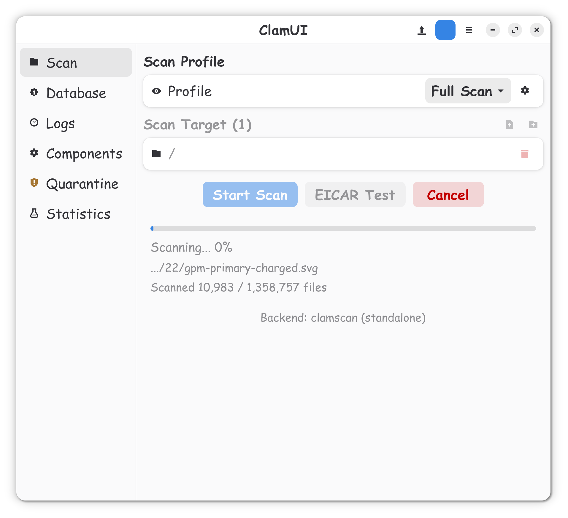 There is an Percentage shown, how many Files and the actual File what is scanned. I don't have that on the .deb Version - and I really miss that because so I can see the Activity and the Progress.