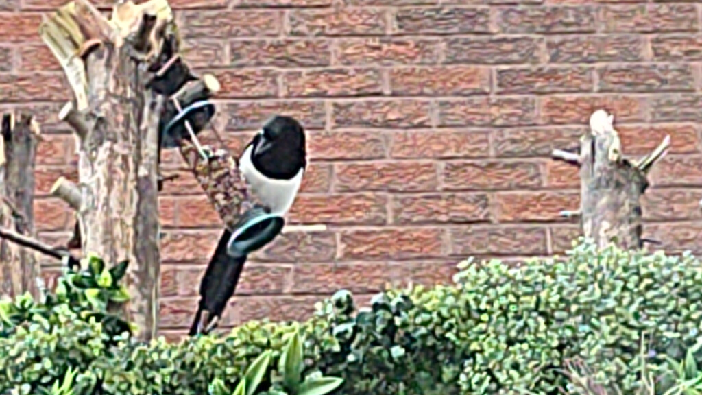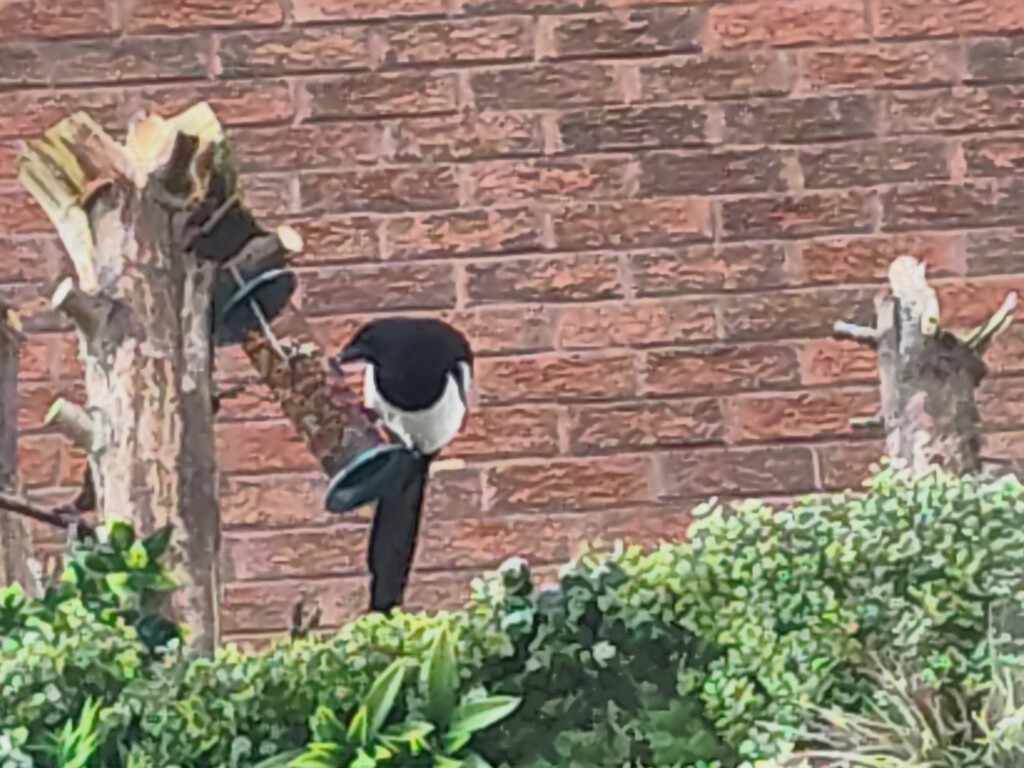 In case anyone is wondering, the bird feeder is positioned on the stump of what was a 40 ft Leylandi that I felled single-handedly using nothing but a pruning saw, extending ladders and semi-stretching 50 meters of climbing rope, is because when it was in hanging position the gale force winds blew it off.