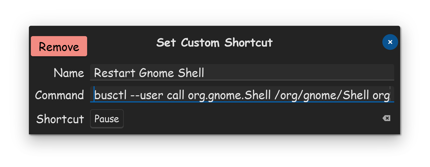 (4) In my particular case for what I was wanting to achieve, I named it Restart Gnome Shell. I then Inputed this command...