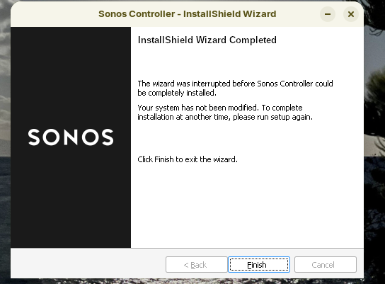 I've installed Winetricks and preformed the donet48 cmd. I also tried a different version if the Sonos exe. and .net framework. The installation process appears as if it's going to make it but always ends with a warning that the Windows Module Installer Service is not installed ( isn't that Windows App Support ? ) and the installation process is interrupted: