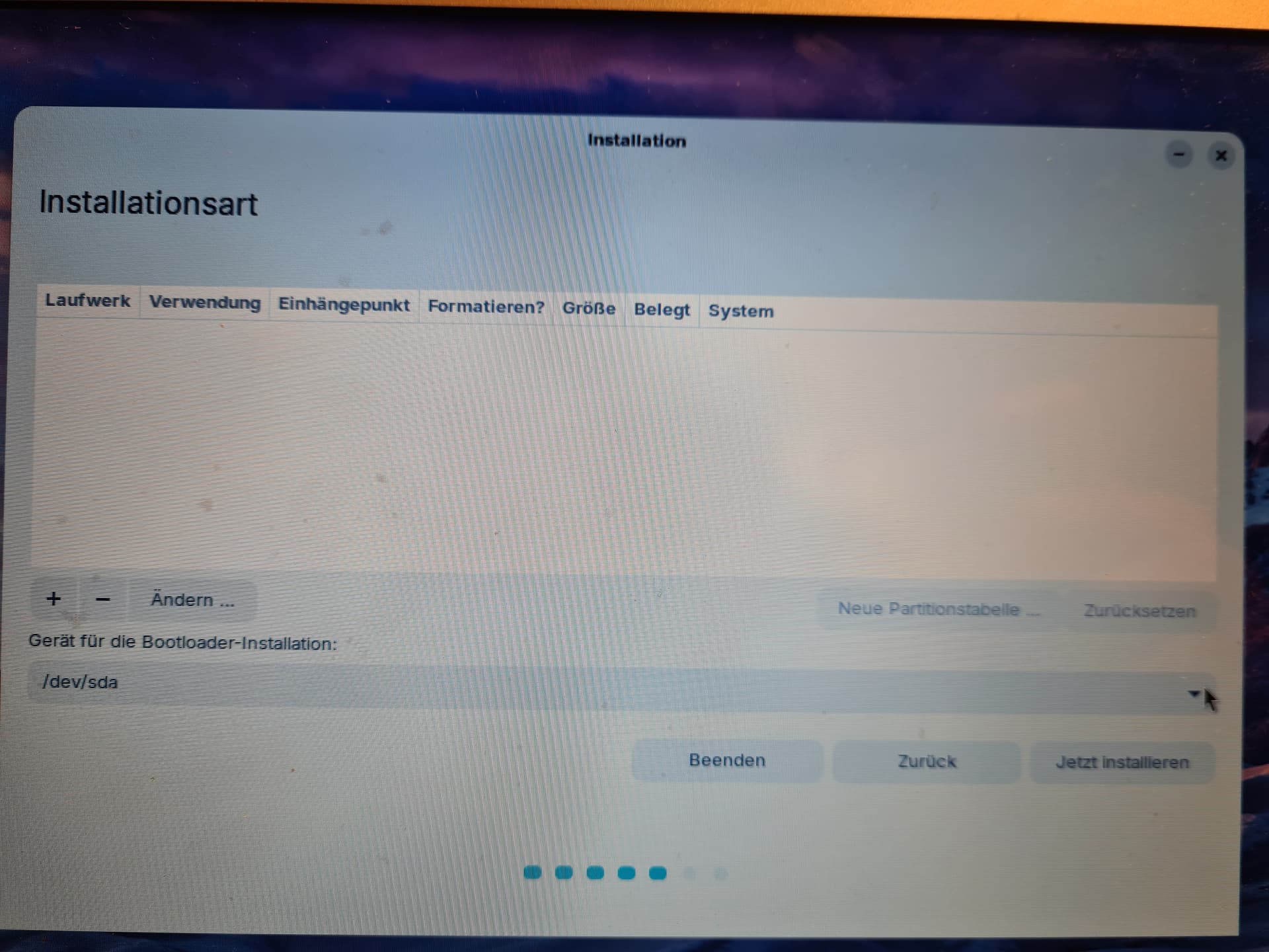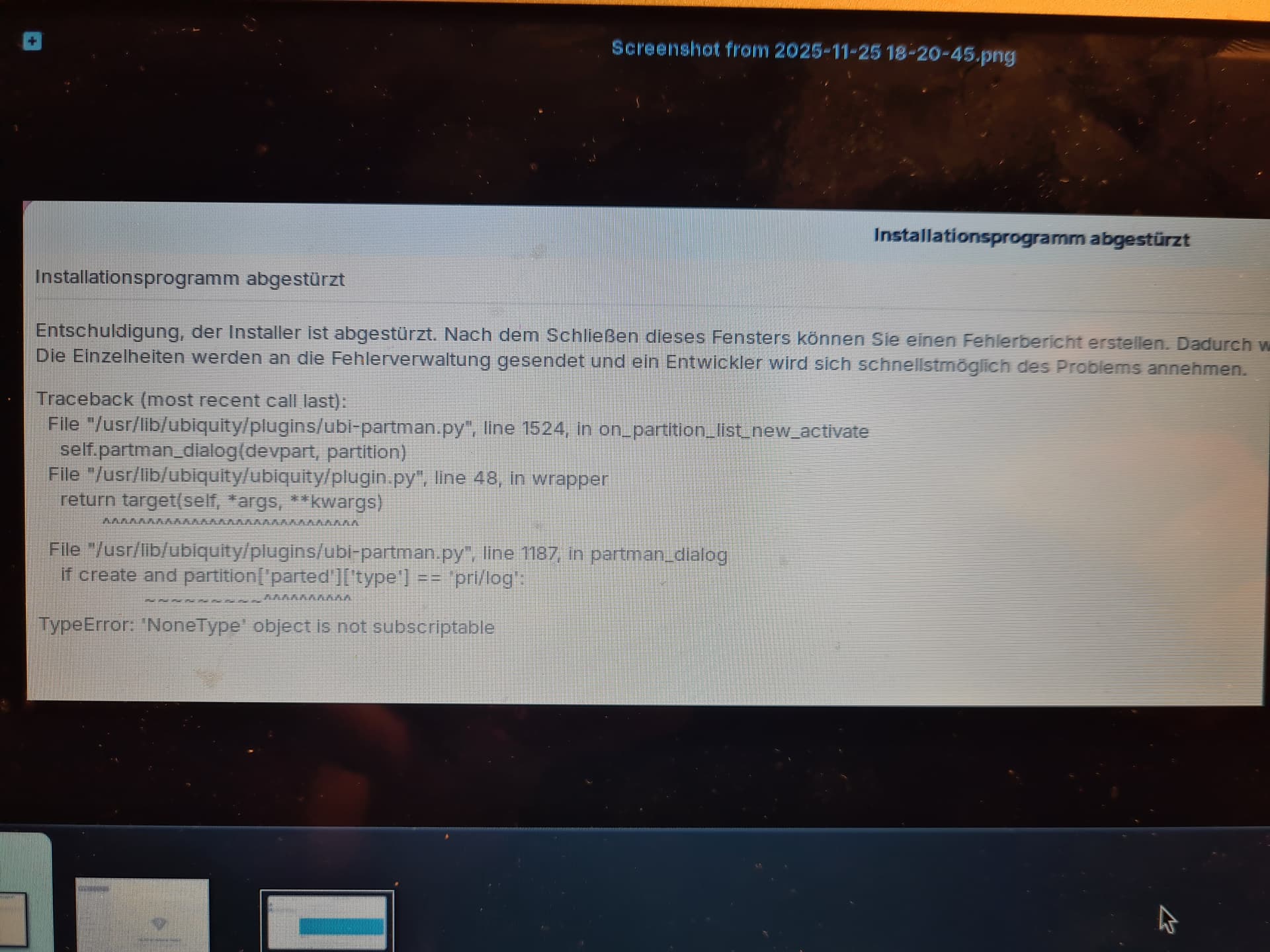 - However, as you can see, there were 0 partitions listed. I clicked the + sign to add one, which is when the installer crashed: