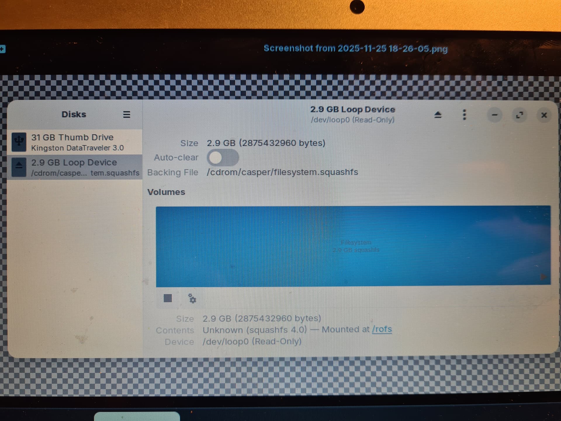 I checked the disks utility and apart from the flash drive, it shows only a "loop device" which has only 2.9 GB.
