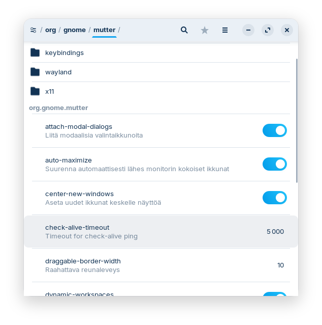 And navigate into: /org/gnome/mutter/check-alive-timeout