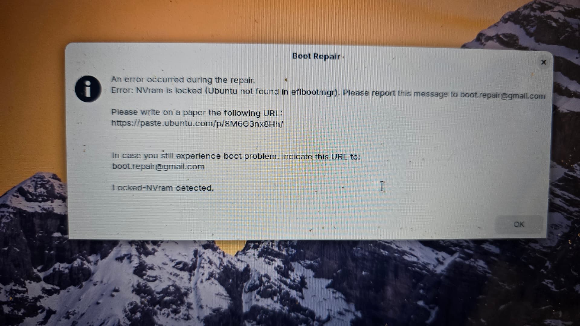 Think so, I installed it years ago and haven't touched it since so I don't remember which partition it's in. Retried boot repair (made sure to set the default OS to zorin this time) and got the same error Ubuntu Pastebin, attaching a pic of the error dialog too (sorry for the bad quality :") )