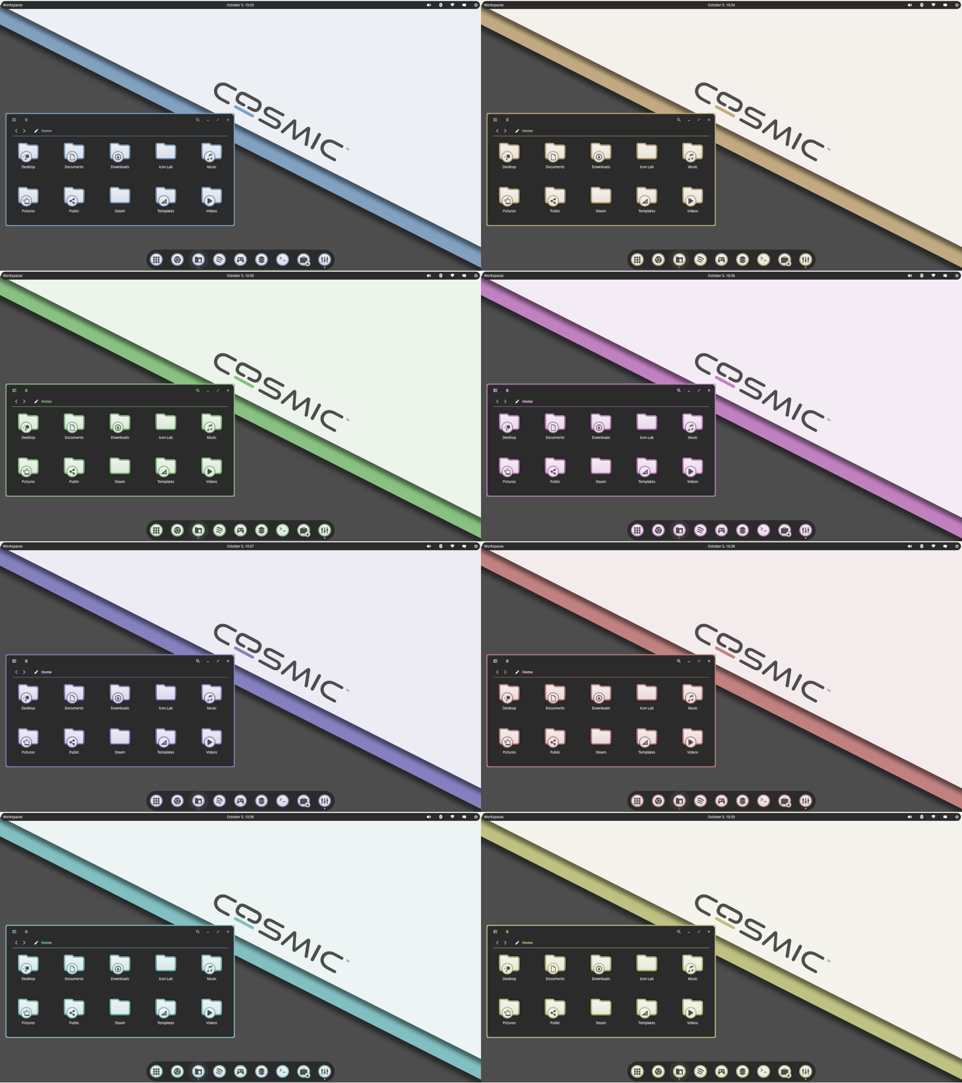 Cosmictron full theme for Cosmic DE has been released! This includes icon themes, wallpaper and color files. 8 different colors are available. All made by me with Inkscape and a text editor app.