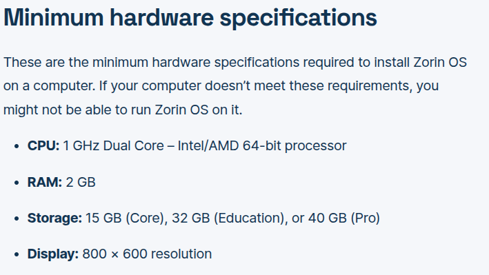 If you do any production, coding, or heavy gaming workloads, you can jump those specs up to an 8-core CPU, 32GB of RAM. When the Zorin team release OS 18 Lite, you could try that instead, as past iterations of lite, used less requirements.