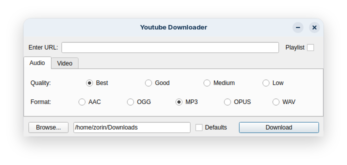 With Zorin OS 17 core I used this sequence: youube page,online converter page... copy video url,paste url to converter... Video to MP Conversion... MP3 file downloaded on "downloaded" ready to be included in playlists on a flash drive, to be listened to in the car