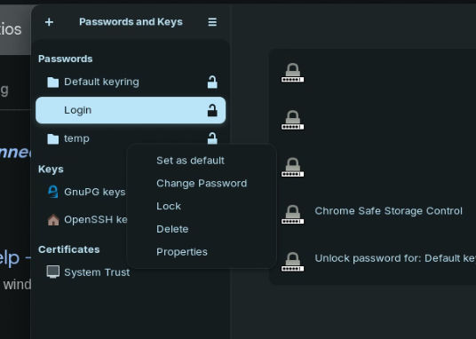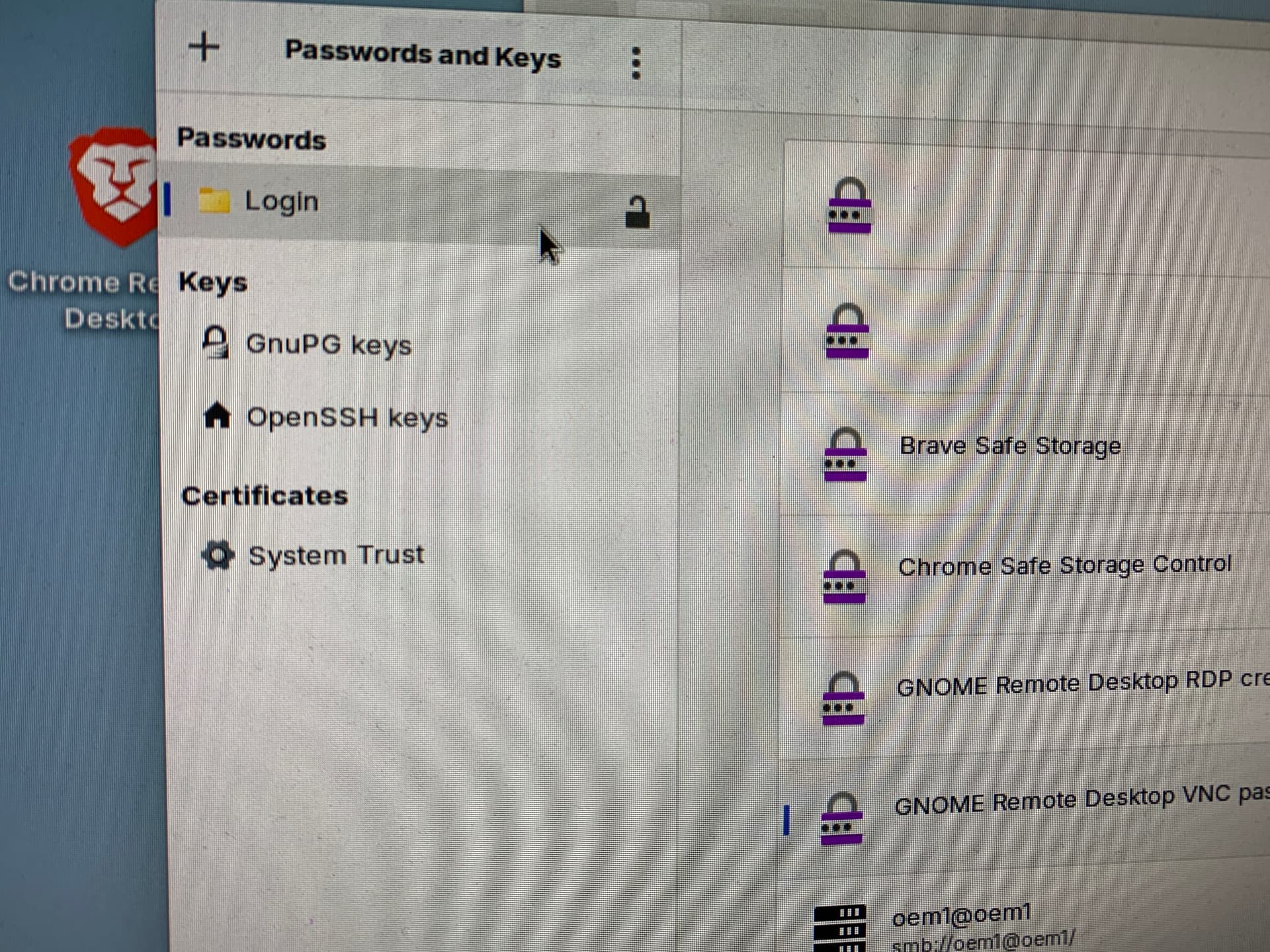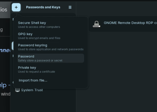 Next be 'very careful' and delete the existing keys called "GNOME Remote Desktop RDP credentials" and "GNOME Remote Desktop RDP password" in the 'Login' and 'Default keyring' lists on their right side panel. [I've done mine already, so no screenshot available for that.]