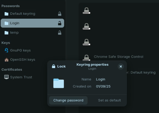 note #2 - when you create a 'new' keyring it may not immediately appear in the list along with the "Default Keyring" and "Login" keyrings.