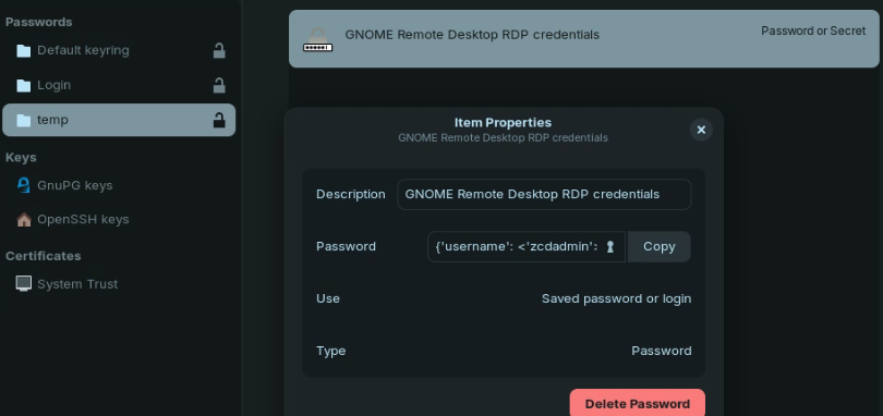 I created a new key called "temp' and clicked the '+' and added a new "Password" key item, to the 'temp' keyring. I called it the same as the existing one that will be deleted. "GNOME Remote Desktop RDP credentials".