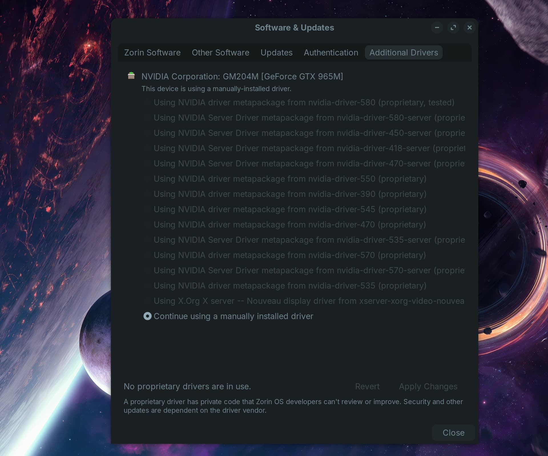 The 965M is the Maxwell Nvidia line - so the 535 driver should be the most stable on it (570 and 580, etc are aimed at the Newer cards). I am not sure which driver you are on at the moment..