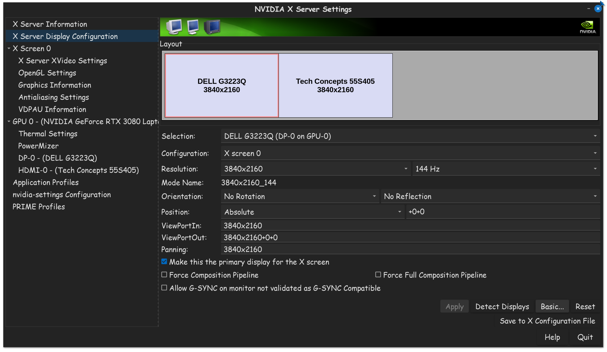 My Nvidia X isn't showing all of that. I tried running $ sudo prime-select nvidia and that didn't change anything. And external monitor is connected via Display to Display cable