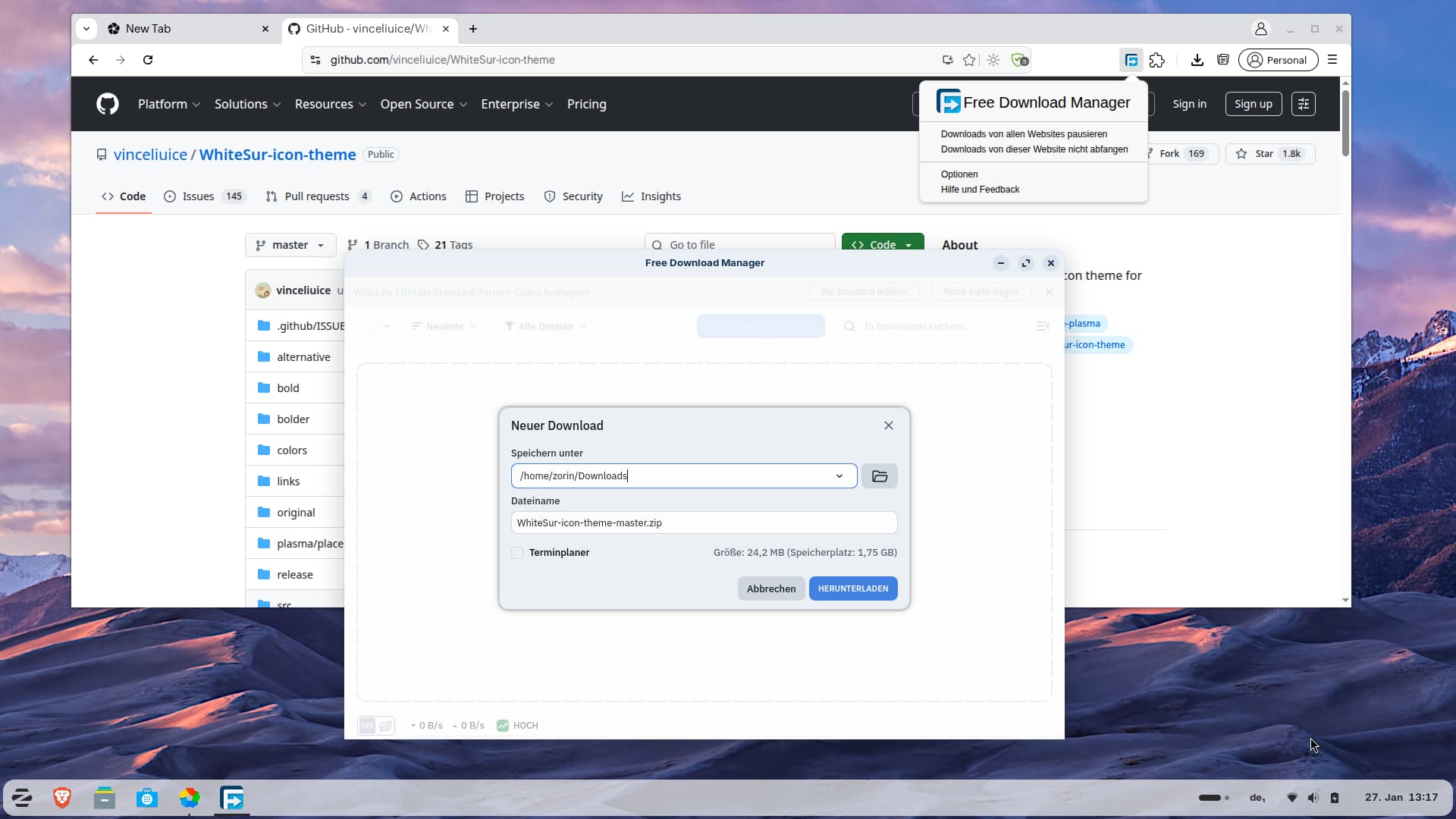 Here you can see my test. I tried to download an icon theme from github and the FDM was automatically opened, also the Plugin in the topbar of the browser looks right.