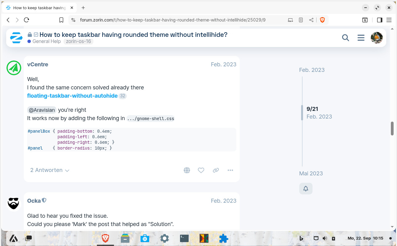 Edit: It seems you are using Zorin 18, I'm on 17. In 18 there is also the option to use floating taskbar without intellihide as shown on your screenshot and you don't need to change the css. Great that this function has been added!!