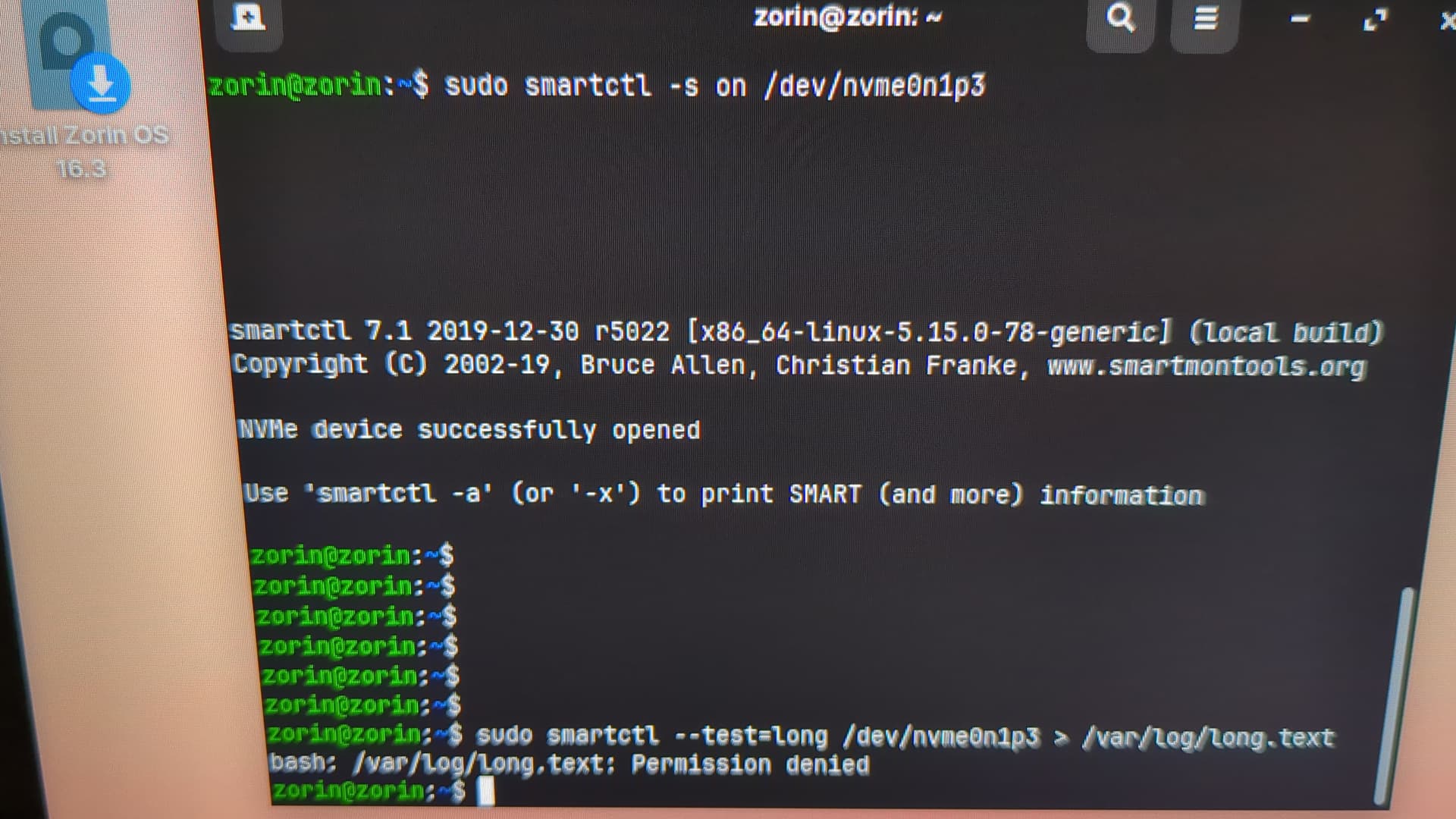smartctl --test=long /dev/nvme0n1p3 > /var/log/long.text