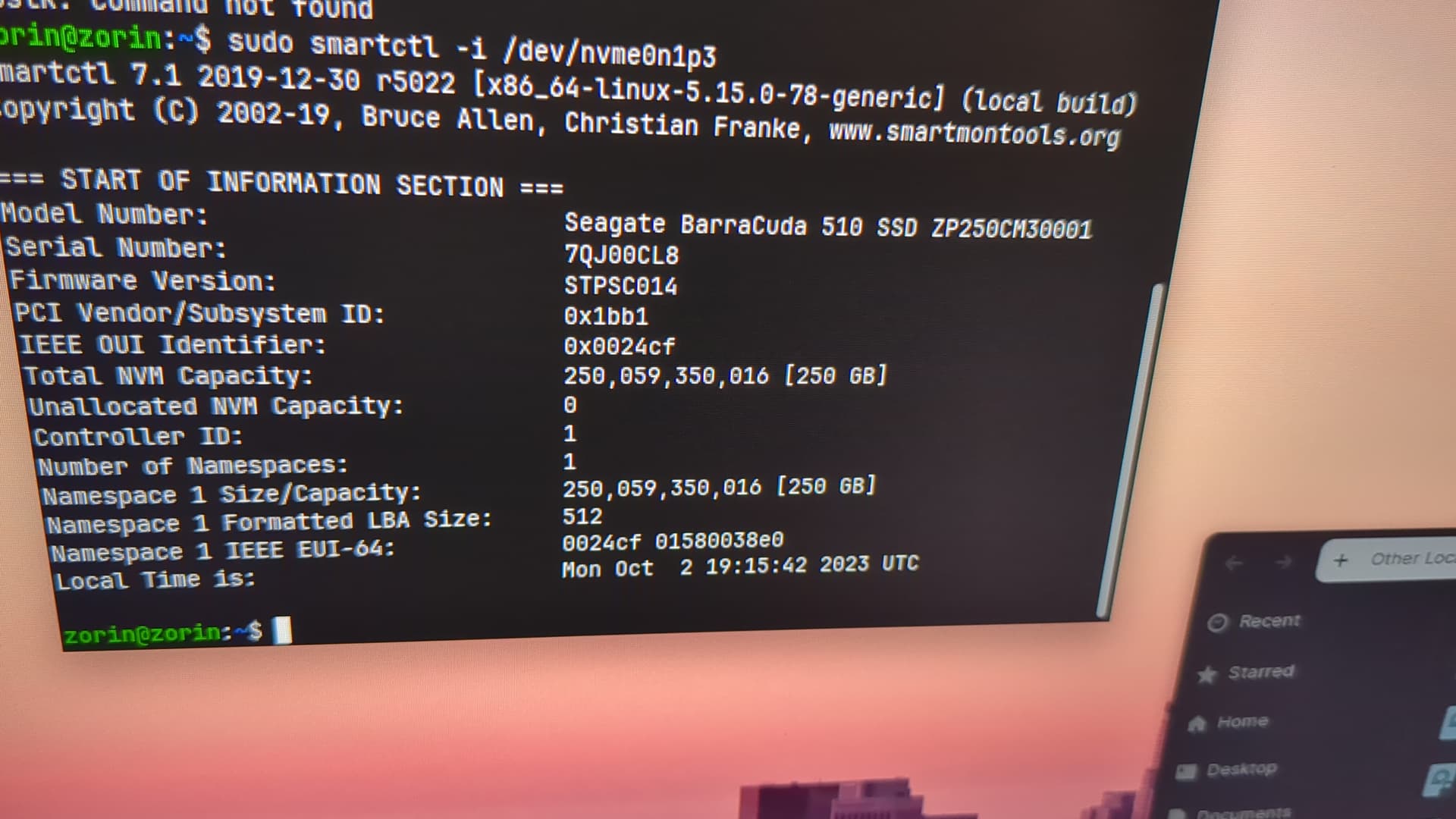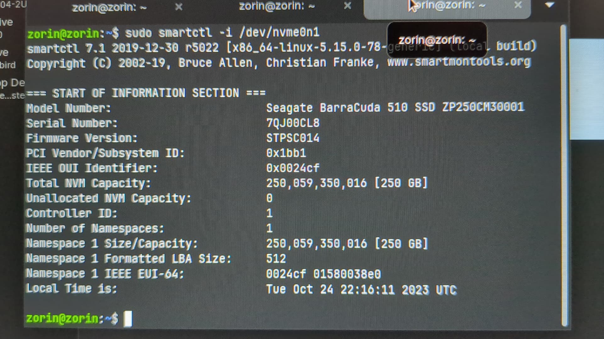 Ive tried the "sudo smartctl -i /dev/(insert drive here)" command on various drives, and the command works on all drives apart from the 250 GB nvME one. I think this is because the drive is still encrypted from a previous zorin installation attempt.