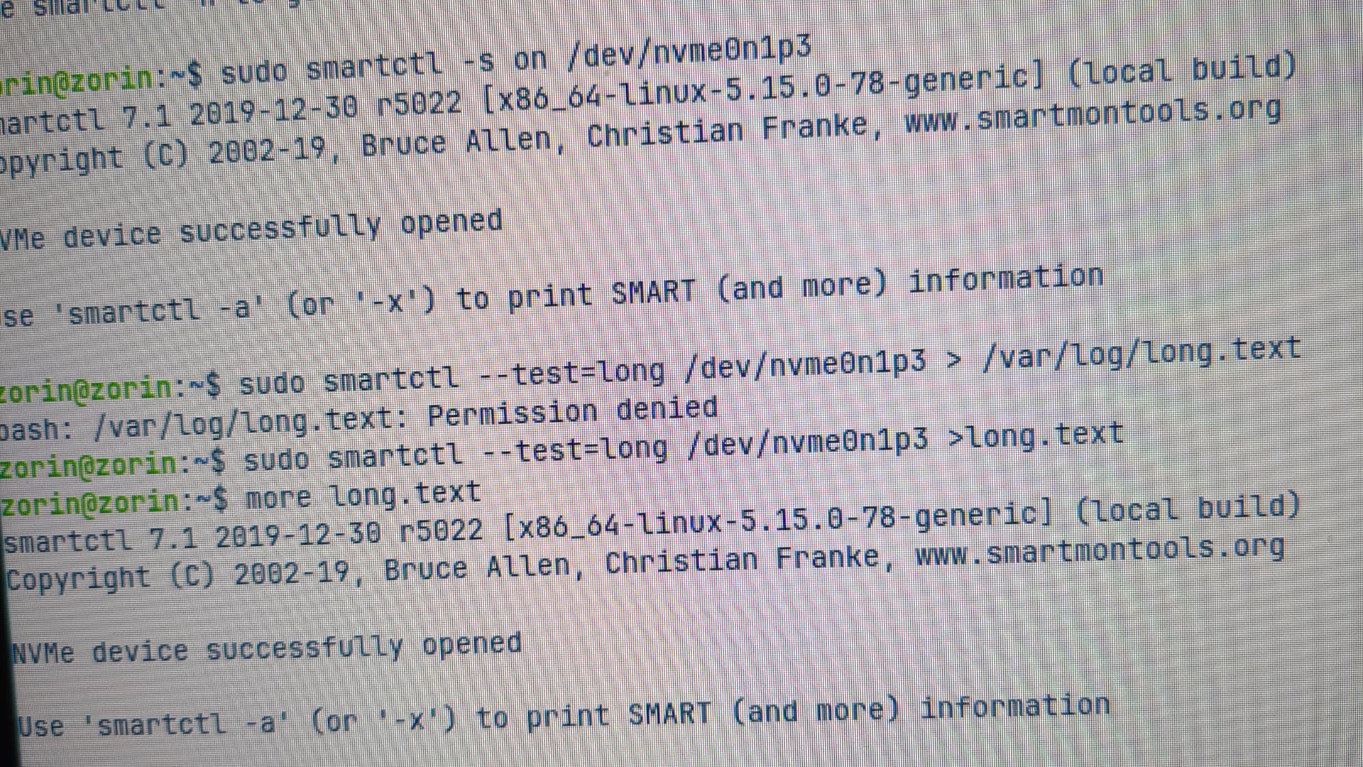 smartctl --test=long /dev/nvme0n1p3 > ~/long.txt