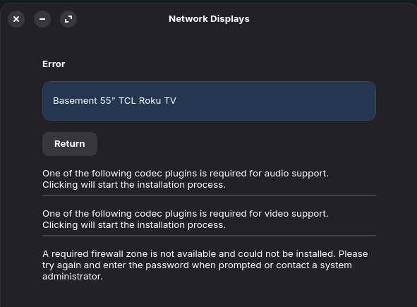Thanks for the advice. I installed all of the codecs and reinstalled ubuntu-restricted-extras, but I still receive the same three error messages. I am leaving the UFW turned off as it previously caused a crash (black screen) at bootup and required me to disable it by using the second option from the grub menu and then dropping down into root to disable it, which was a white knuckle experience. Perhaps updating to Zorin 18 Core when it becomes available will resolve the connectivity issue as 18 might include the required codecs? Or perhaps my model of Roku TV just isn't compatible?