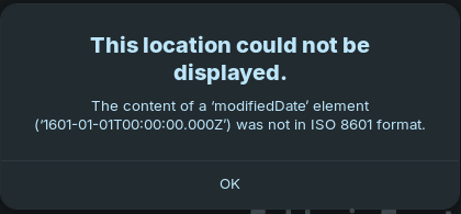 The error "This location could not be displayed. The content of a 'modifiedDate' element ('1601-01-01T00:00:00.000Z') was not in ISO 8601 format" typically occurs when one or more files in your Google Drive have an invalid or corrupted modified date , specifically set to January 1, 1601 — a known Windows epoch value that conflicts with Unix/Linux systems.