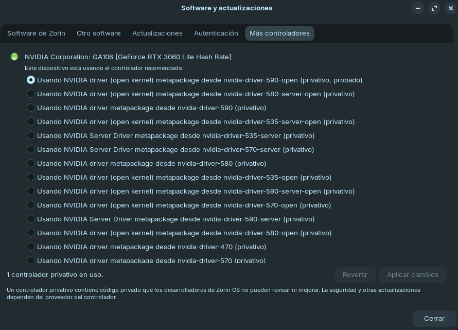 I am using the proprietary NVIDIA drivers selected through the “Software & Updates” application. Specifically, the one listed as: “NVIDIA driver (open kernel) metapackage from nvidia-driver-590-open (proprietary, tested).”
