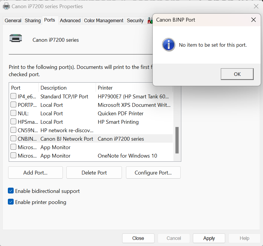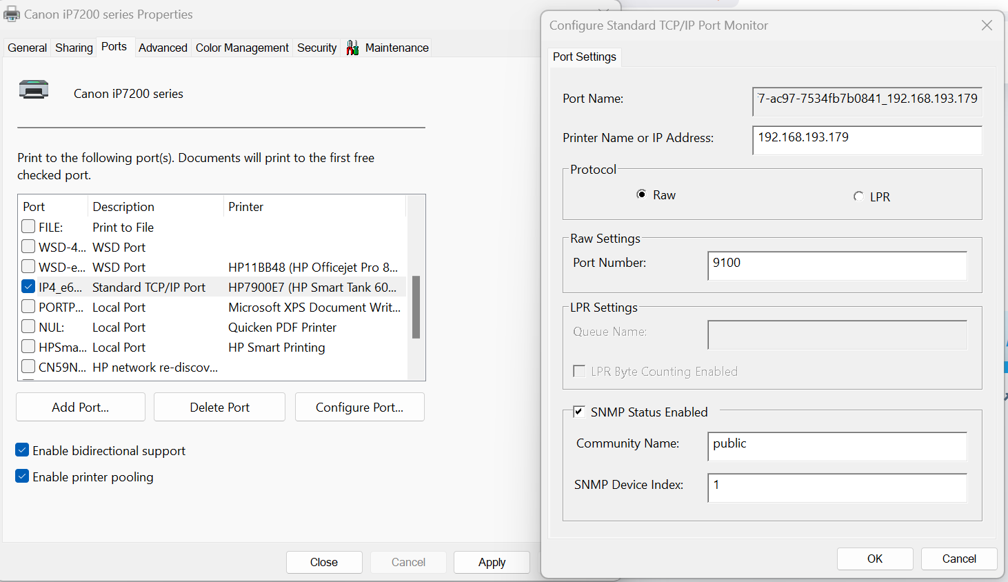 I'm trying to get the IP address via this route. However it looks like the recommended port cannot be interrogated via Configure port to see the IP address. It looks like my Smart Tank is allocated to the TCP/IP port (2nd screenshot)
