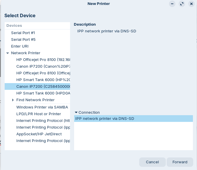 I found the IP address which is 192.168.193.246. I followed your directions but at the Choose Driver screen (around 01.16 in your video) I have 2 choices as shown below. I tried the Canon IP7200 series -CUPS+Gutenprint v5.3.4...... option but when it came to doing a Test Print, nothing happened.