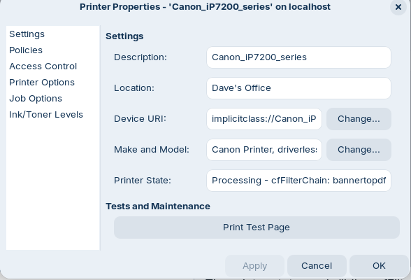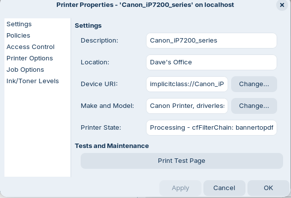 I select "Print Test Page" and get a message that the job is submitted. The screen changes to: