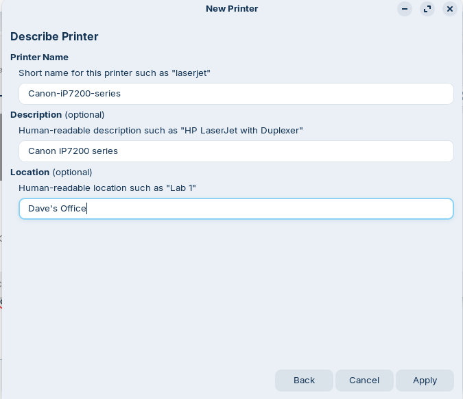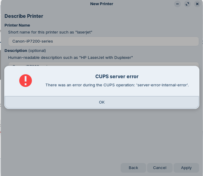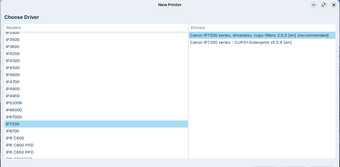 - Remove the existing printer configuration via the system settings, then use the "Add Printer" function. The system should automatically detect the printer as "Canon iP7200 series Ver.3.90" and configure it correctly.