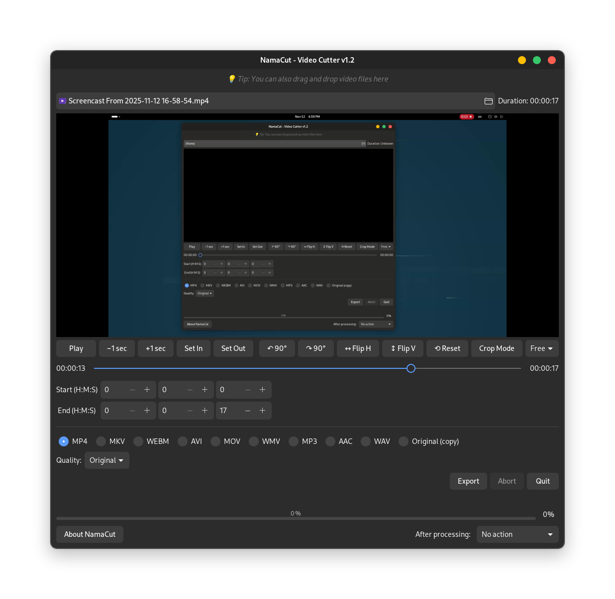 Upon loading an input video (webm, 1080p, 1.9GB) and click Play, nothing would happen. Could not reproduce. I'm wondering if something cached the video (either one of Namacut's dependencies or Linux itself) to cause this not to repeat, but I have no idea and will retest next time I restart my computer.