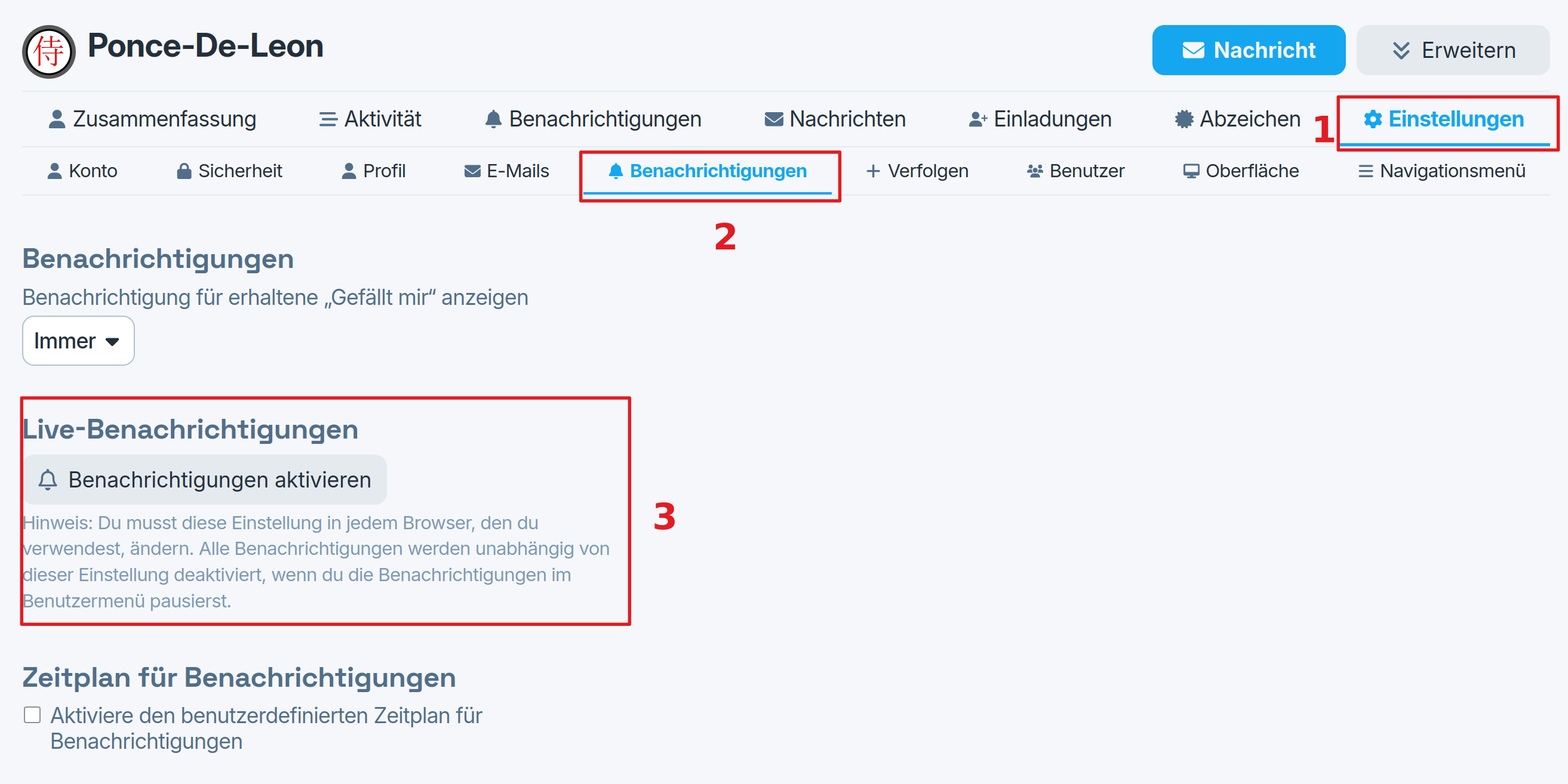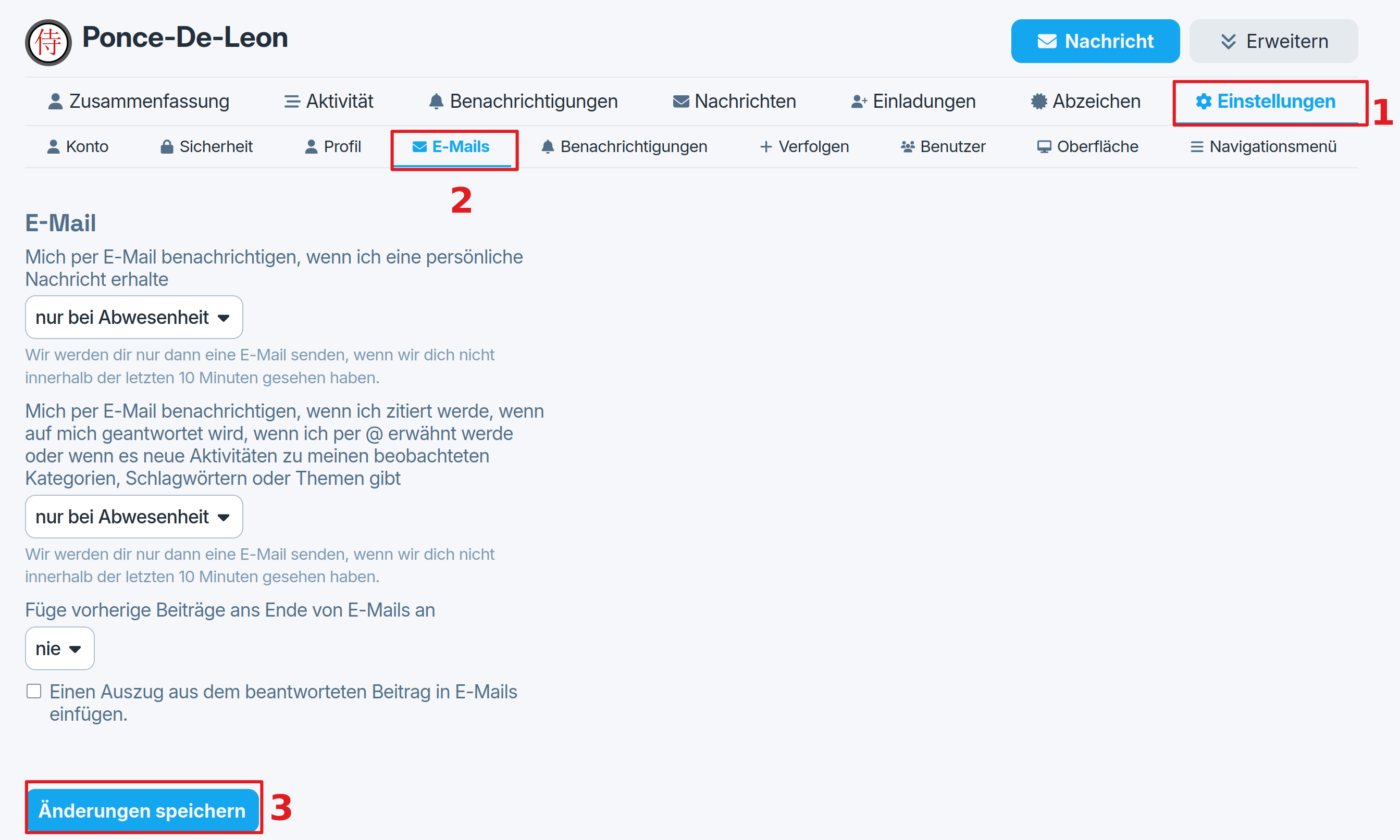Then You click on Settings (1), then E-Mails (2), set up Your Mail-settings and then click on Save Changes (3). Don't forget the last One!