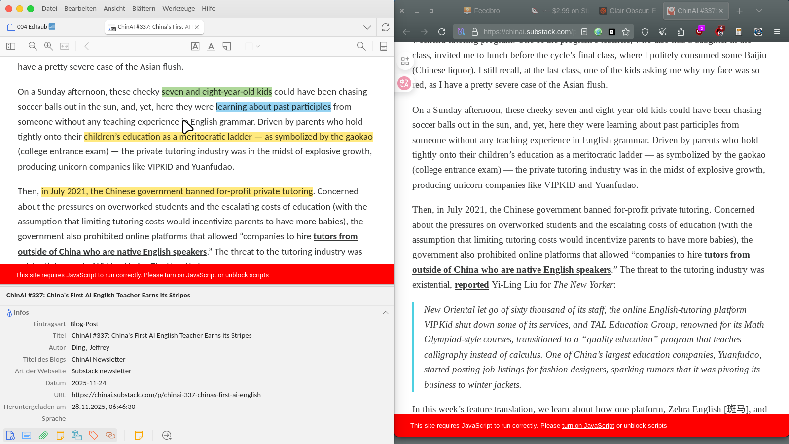 On the left, I keep a copy with colorized highlights of articles.