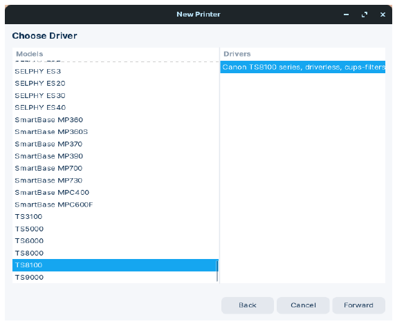 In my case, for my Pixma TS-8151 printer I need to choose the TS8100 series driver.