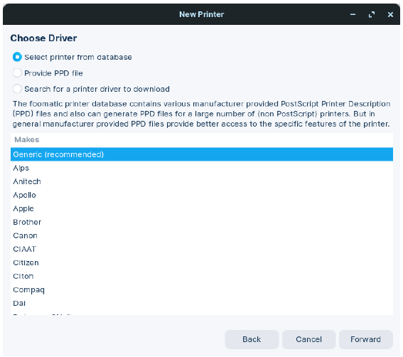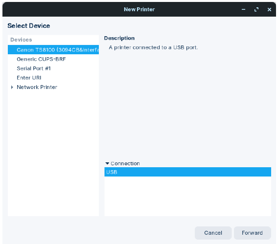 You will need to scroll down until you see the manufacturer’s name of your printer. In my case it is Canon. And once we have found the correct name, select Forward bottom right of the window.
