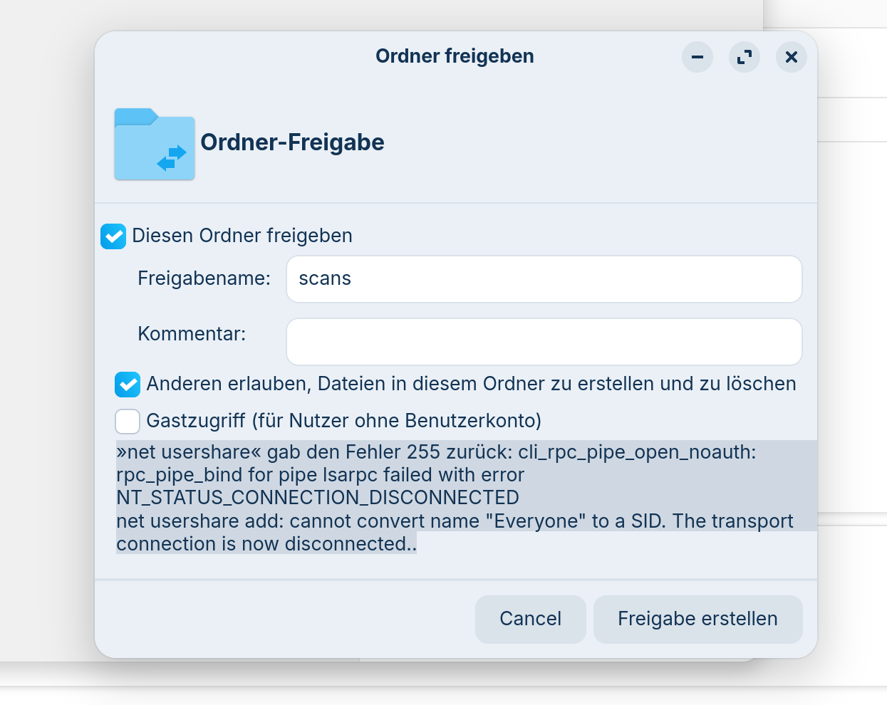 To save scans to a shared folder on the server, create a dedicated directory for scanned files, for example /home/matt/Scanned , and ensure it is writable by the saned user or the user running the scan. You can then configure the scanning software to save files to this directory. If you want to share this directory over the network using Samba, set up a share in /etc/samba/smb.conf :