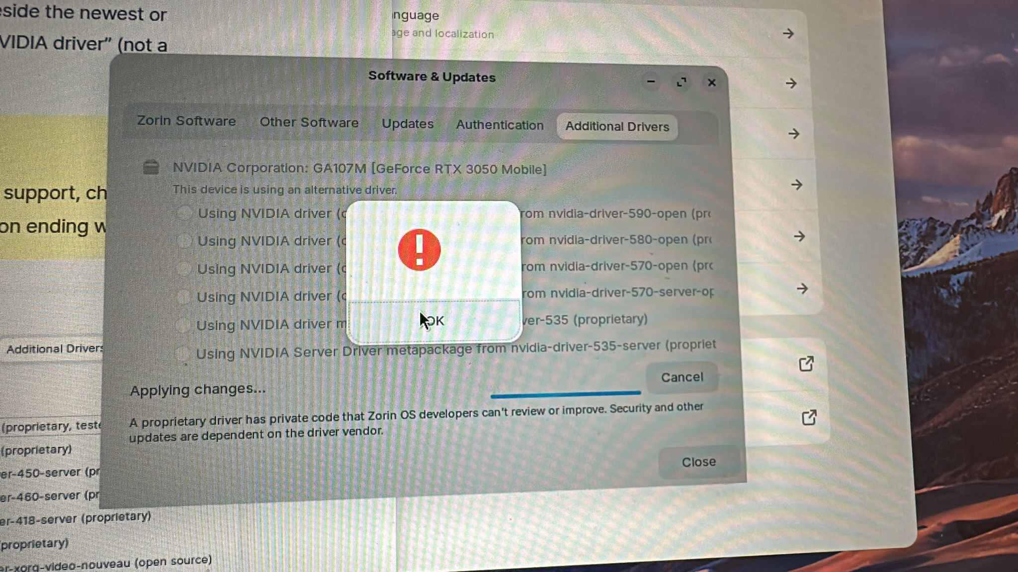 The open Driver ... Well when that works, all is good. I wouldn't name that in the first Place and advice the non-open one but what matters is that it runs. And because You have a 3050, the 590 Driver isn't an Issue, too.