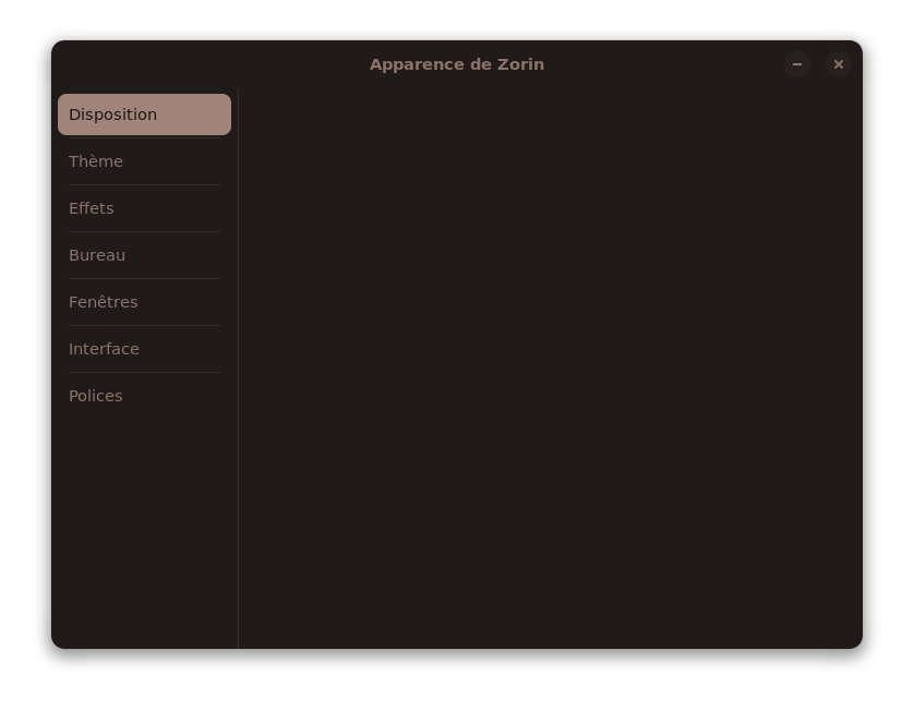 And when trying to change Zorin's appearance with the Appareance tool, I have nothing in the Disposition menu.
