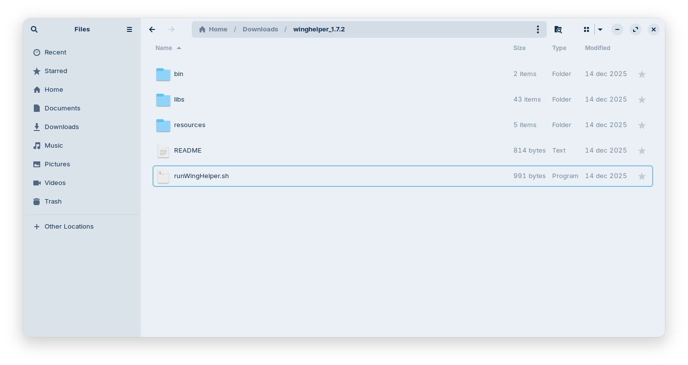 export PATH=[/home/bluedot/Downloads/winghelper_1.7.2]:$PATH; run WingHelper.sh