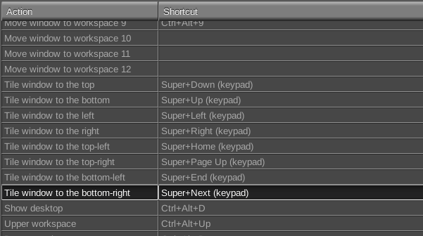 OK from the "Tile window to the top down" to "Tile window to the bottom-right" I have nothing under shortcut ....