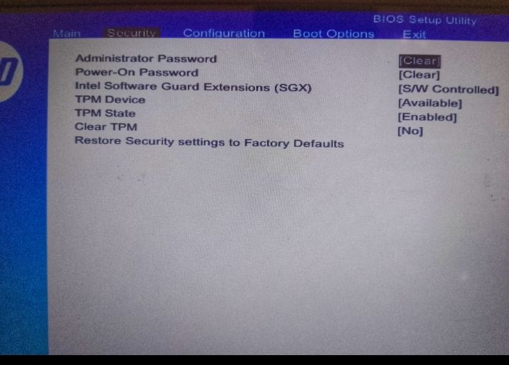 Here, I would suggest to disable TPM. The last Point ''Restore Security settings to Factory Defaults'' could be an interesting Point if it would disable Secure Boot. but because it isn't clearly labeled, I would let it be.