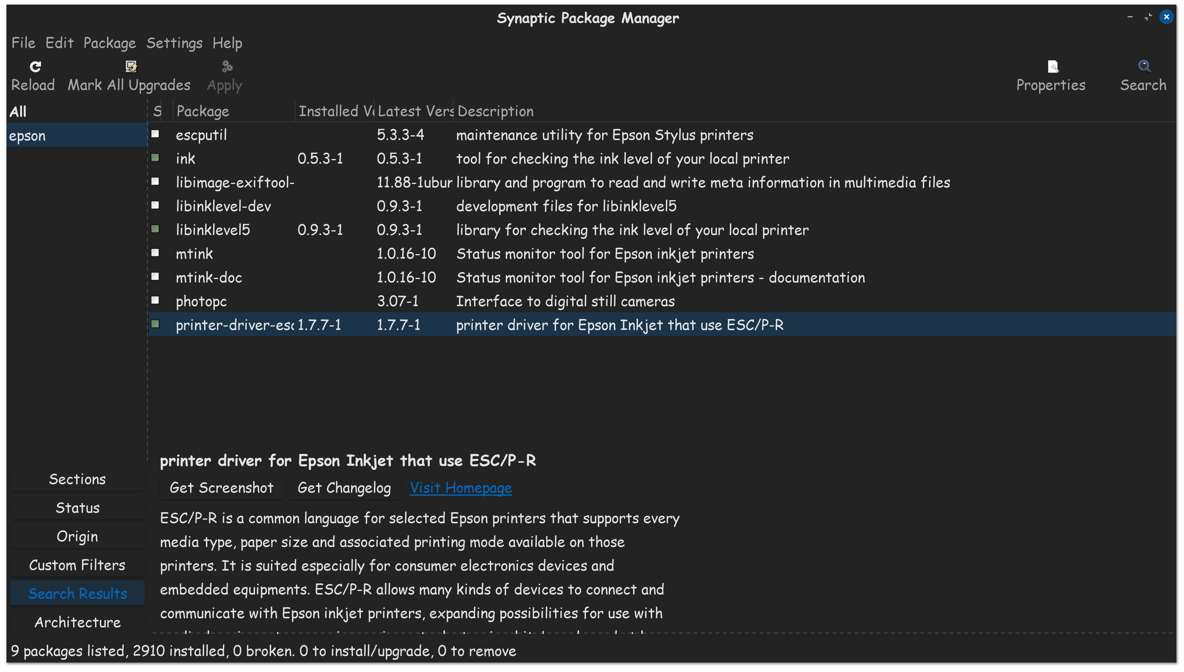 I love to use Synaptic Package Manager, for finding specific driver & component software, that may not be found, in the software store itself. I typed in Epson, & this is what I found. Make sure the bottom one is installed at the very least.