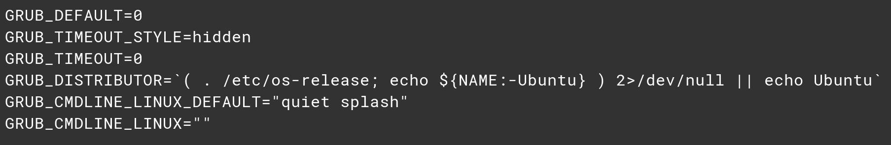 Here change 2 Lines like You see on my Picture. Change GRUB_TIMEOUT_STYLE to hidden and GRUB_TIMEOUT to 0 (it is a zero and not the Letter O). If done, press ctrl+o to save the Change, Enter to confirm and ctrl+x to exit.