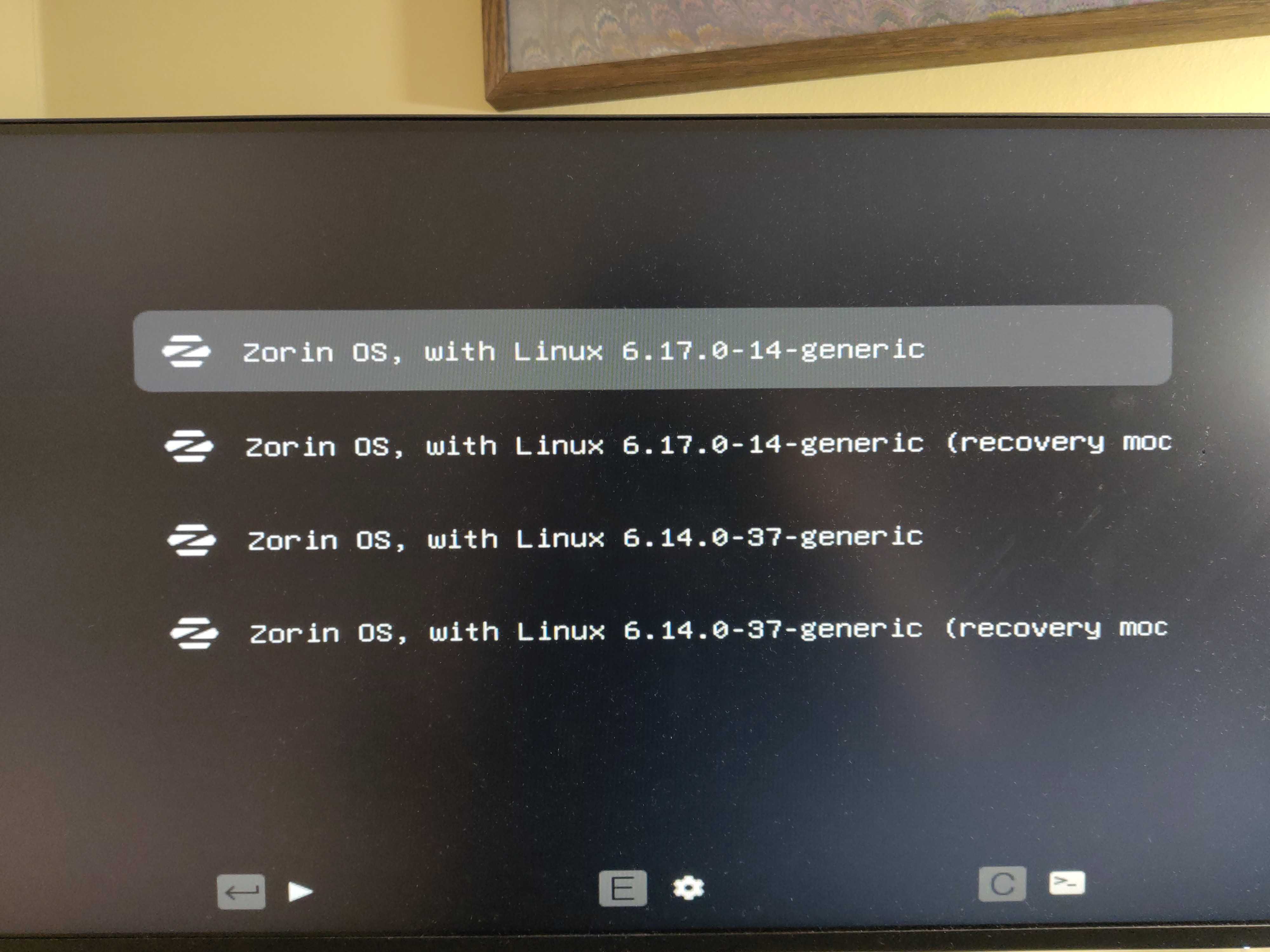 I then tried the other booting option, Zorin OS with linux 6.14.0-37-generic, which loaded fine but is acting strange (keyboard not responsive, lots of blinking). So it seems that getting 6.17 to work is necessary.