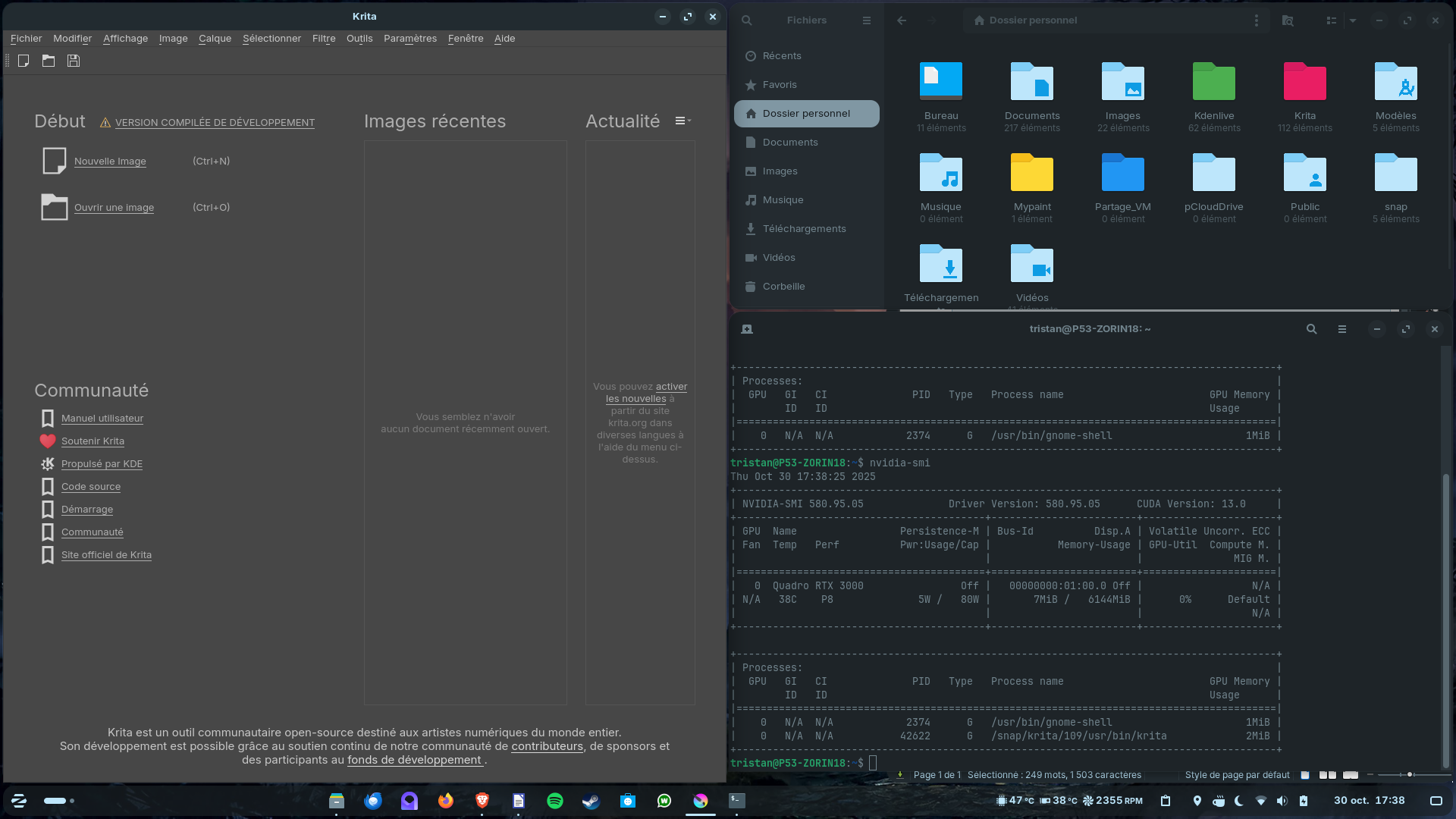 I first tried just after installed Zorin (yesterday), to ensure Krita’s Flatpak was using my Nvidia GPU when needed ; the funny things is that it was working as expected. I don’t know why today it doesn’t. The thing i did as usual with Ubuntu / Kubuntu), is switching to my Intel card when I needed and back to Nvidia or On-demand Mode.