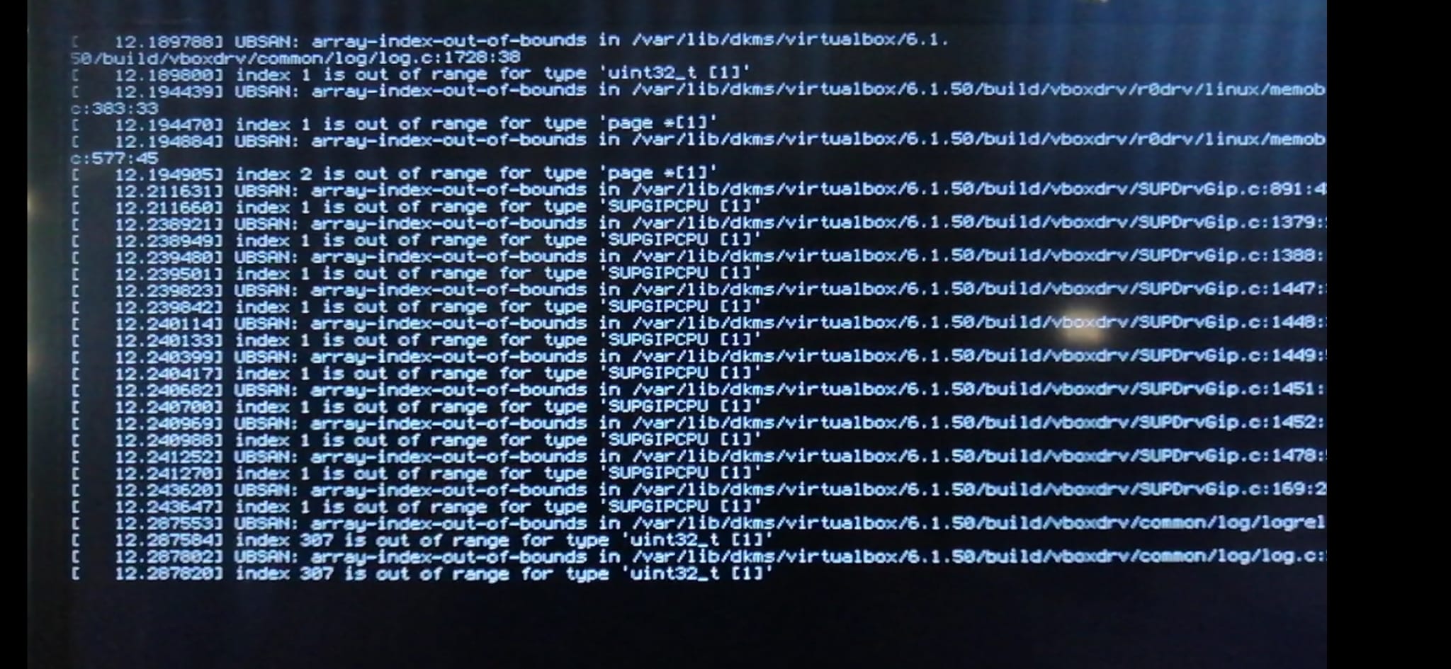 12.[xxxxxx] UBSAN: array-index-out-of-bounds in /var/lib/dkms/virtualbox/6.1.50/build/vboxdrv/SUPDrvGip.c.xxxxxetcetera