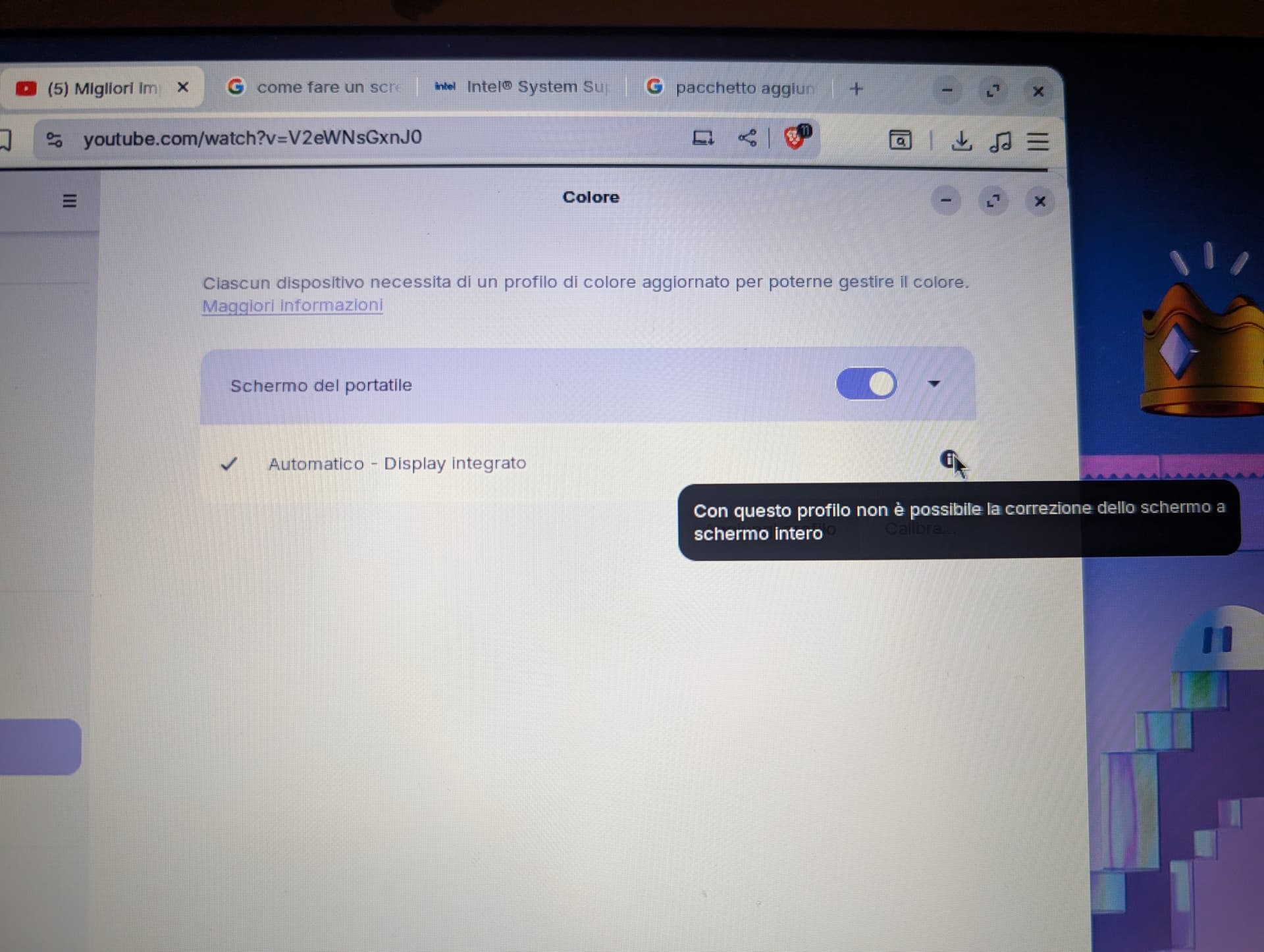 the Intel graphics drivers and Zorin OS 18. I've noticed that in certain usage situations, the color seems unnatural and lacks brightness or something. On YouTube, the red in the player bar seems to lose color quality. In the Color settings, the automatic profile gives me the following warning: "With this profile, full-screen correction is not possible." I don't know what this means, but it's not a good sign. To the experts on this topic, ask for support to try to resolve the issue. The color in the restart menu has also changed to a saturated red with the name "restart" changed to red. I don't know if this is temporary or what, but it's still awful.