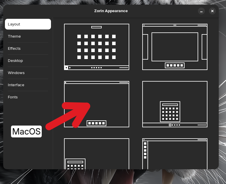 The Zorin MacOS Layout is available in the Pro Version and is this one: