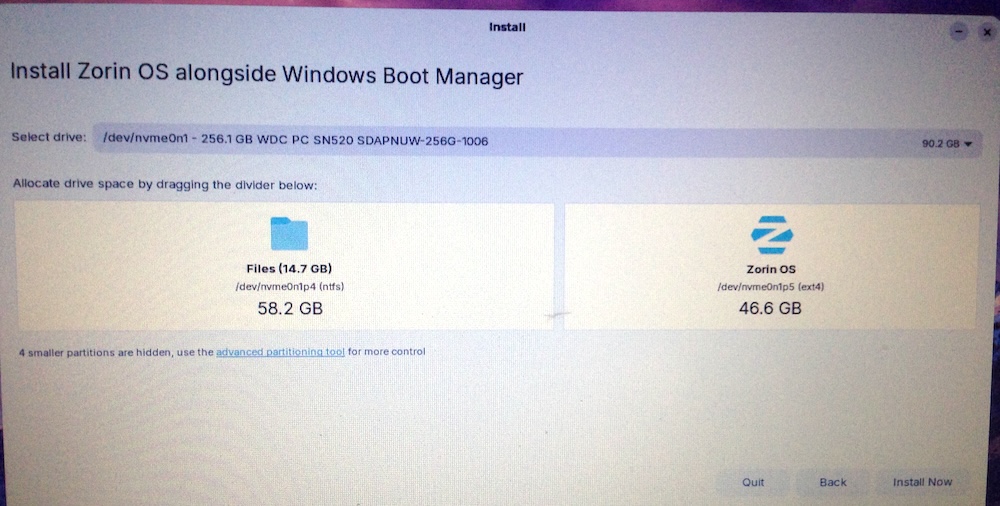I want to install Zorin 18 Core on an HP i5 laptop. I want to keep Windows 11 installed for now. It has a 256 GB SSD, partitioned into NTFS drives C and D. D is basically empty. Of course, I selected the “Install alongside Windows” option. Then I received the following confirmation: