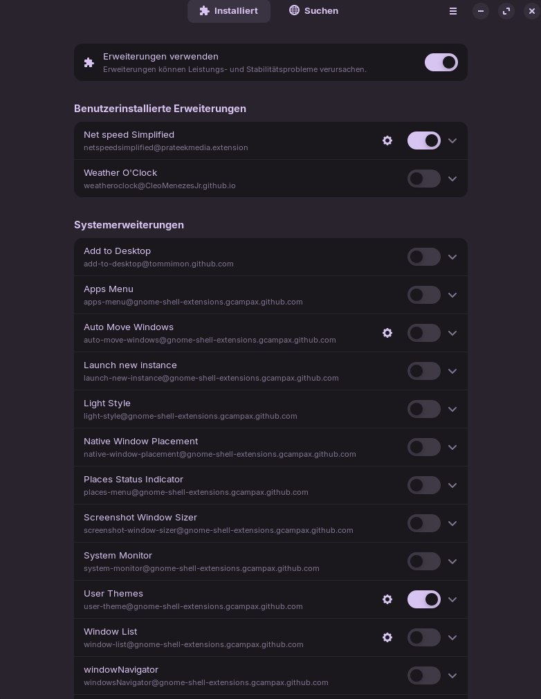 So the extension can not be installed manually, but also isn't installed if I check out Installed Extensions - GNOME Shell Extensions or the gnome-extensions app: